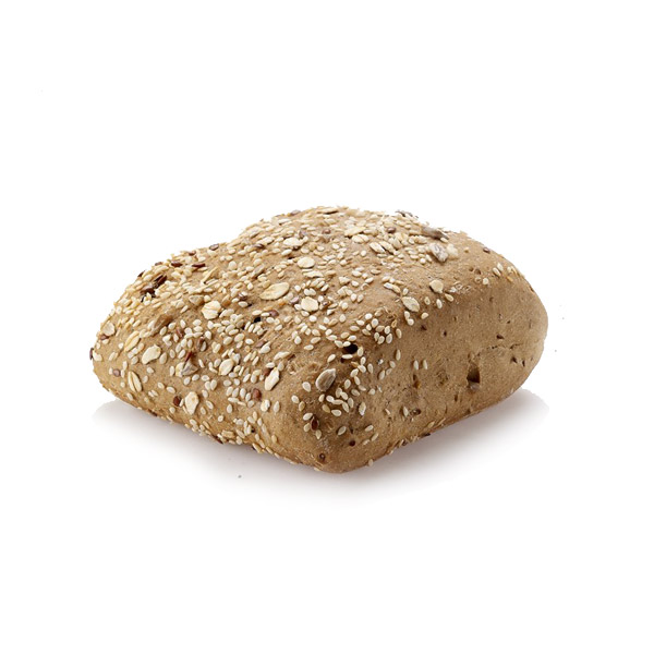 Breakfast bun with hard crust and multiple grains topping.